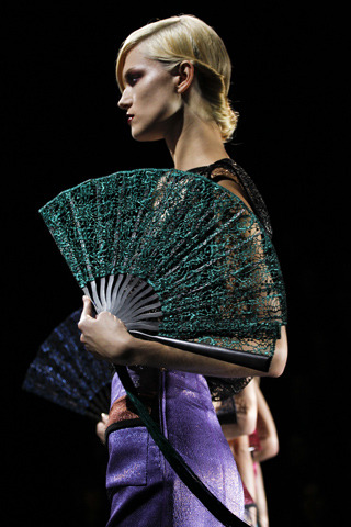 We could see the awesome "hat" made with three fans in Armani prive 2011 fall/winter, and....why not? Fans are lightweight and have a very large surface to protect us for the sun! today's fashion is characterized for putting everything under question marks, for questioning the functionality of everything, to then move whatever around and play with it.